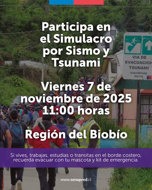 El Servicio Nacional de Prevención y Respuesta ante Desastres (SENAPRED) invita a la comunidad a participar este viernes 7 de noviembre a las 11:00 horas en el simulacro de evacuación por sismo y tsunami que se realizará en las comunas del borde costero de la Región del Biobío.